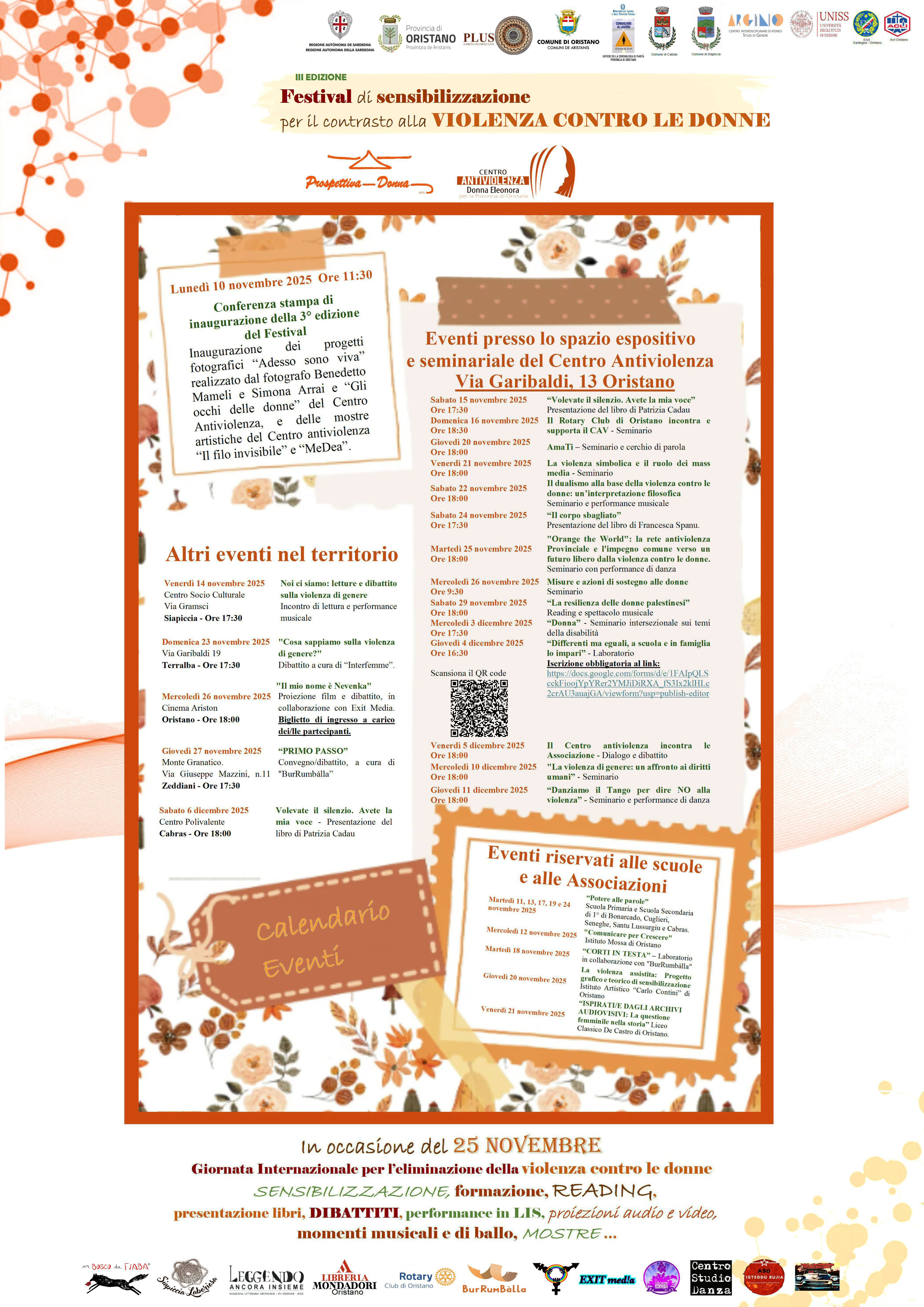 LIBERE DI DIRE DI NO 11 11 2025 - In occasione del 25 Novembre, Giornata Internazionale per l’eliminazione della violenza contro le donne, il Centro Antiviolenza “Donna Eleonora” di Oristano, con l’Associazione Prospettiva Donna, con il Patrocinio di Enti, Istituzioni ed Associazioni, organizzano, nella città di Oristano e nel territorio Provinciale, un intero mese di incontri sulle tematiche di genere, con la finalità di sensibilizzare e formare sul tema della violenza di genere. Tema centrale di questa preziosa occasione formativa e di sensibilizzazione, sarà l’analisi della violenza contro le donne come fenomeno culturale, sociale e globale, attraverso reading, presentazione di libri, dibattiti, performance in LIS (Lingua dei Segni Italiana), proiezioni audio e video, momenti musicali e di danza, con mostre fotografiche e artistiche. Invia Stampa Condividi su: Facebook Twitter Linkedin Google+